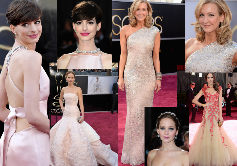 Some lovely blushes and coral tones in a range of fabric textures. Anne Hathaway's Prada dress has a beautiful sheen satin look to the fabric which is very glamorous and with her pixie crop hair, creates a very cute and innocent look. Jennifer's Dior dress has had mixed reviews but I think it's lovely, she's kept it simple and elegant and the texture of the fabric gives that little twist. Louise's Coral vined dress and tulle skirt is nicely detailed as well as Lara's glittered and sparkled slim one-shouldered dress.